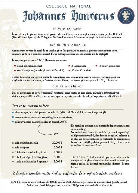 Ihr Name (der von Ihnen vertretenen Firma/Marke) wird auf dem ausgewählten Raum prominent, aber dezent angezeigt, und Sie können mit Kommunikationsmaterialien an allen öffentlichen Aktivitäten teilnehmen, die der Honterus-Kolleg in den nächsten 5 Jahren durchführen wird.